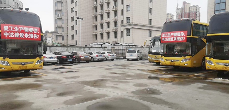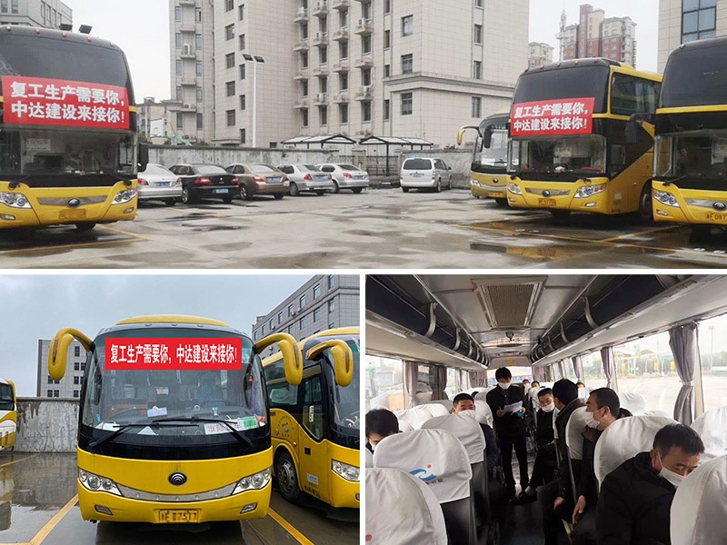 2月29日凌晨1點(diǎn),中達(dá)建設(shè)組織的兩輛大巴車從安徽順利接回了首批返崗工人,將他們?nèi)堪踩椭粮黜?xiàng)目現(xiàn)場。