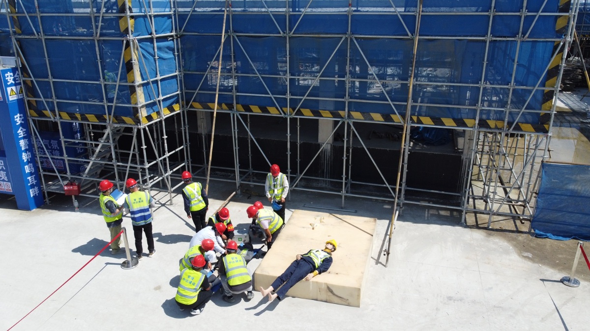 本次演練以架子工在外腳手架上進(jìn)行立桿對接作業(yè)時,因未使用安全帶,腳底打滑,導(dǎo)致從高處墜落為模擬場景。在突發(fā)事件發(fā)生后,項(xiàng)目部對應(yīng)急預(yù)案啟動、警戒救援、技術(shù)調(diào)查、信息上報(bào)等進(jìn)行了實(shí)戰(zhàn)操練。
